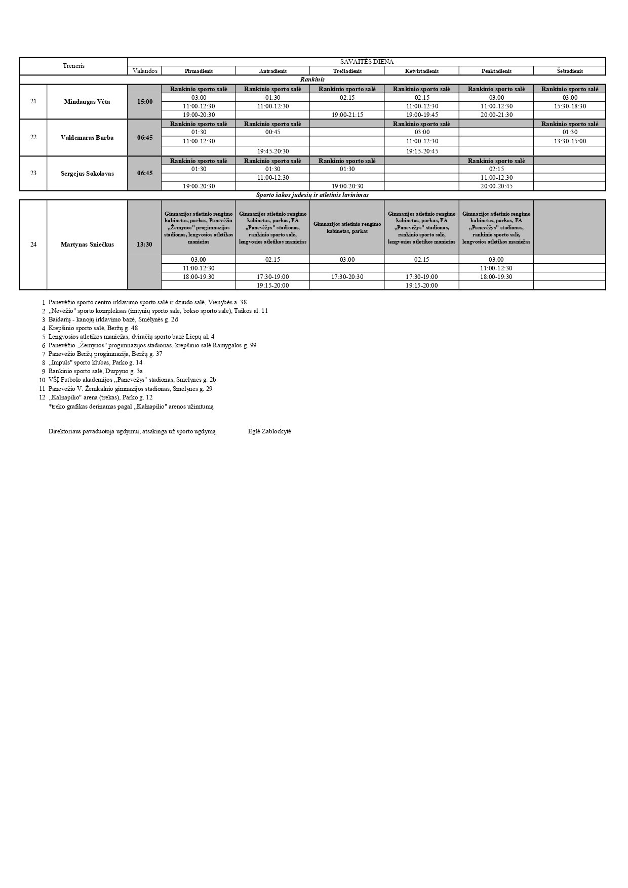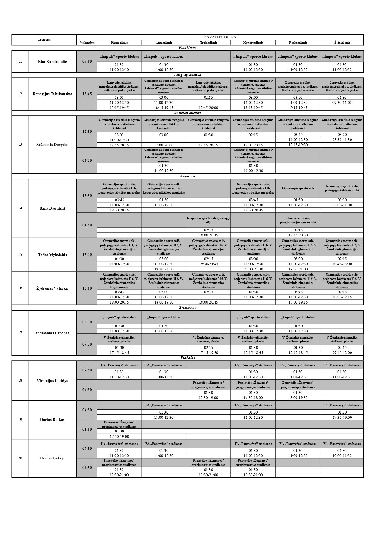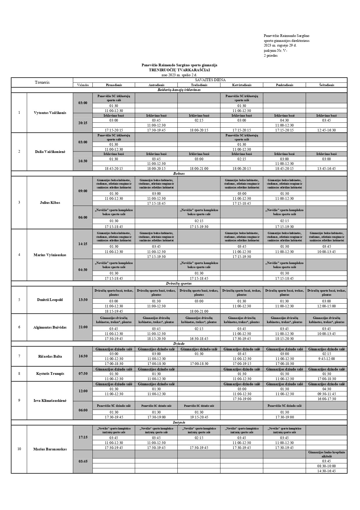 Sportinio ugdymo treniruočių tvarkaraštis nuo 2023-10-02